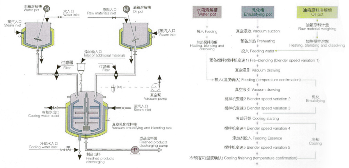 料鍋鍋蓋為自動升降式,水鍋、油鍋中的物料通過輸送管道可在真空狀態(tài)下直接吸入乳化鍋,出料方式為乳化鍋鍋體翻轉(zhuǎn)可傾式,通過電熱管對鍋夾層內(nèi)的導熱介質(zhì)進行加熱來實現(xiàn)對物料的加溫,加熱溫度任意設定,自動控制。在夾層內(nèi)接入冷卻水就可以對物料進行冷卻,操作簡單、方便,夾層外設有保溫層。均質(zhì)攪拌與槳葉攪拌可分開使用,也可同時使用。物料微?;⑷榛?、混合、調(diào)勻、分散等可于短時間內(nèi)完成。與物料接觸部位采用不銹鋼(醫(yī)用采用316L材料制造,內(nèi)表面鏡面拋光,真空攪拌裝置衛(wèi)生清潔,采用符合GMP規(guī)范的衛(wèi)生標準制造)。